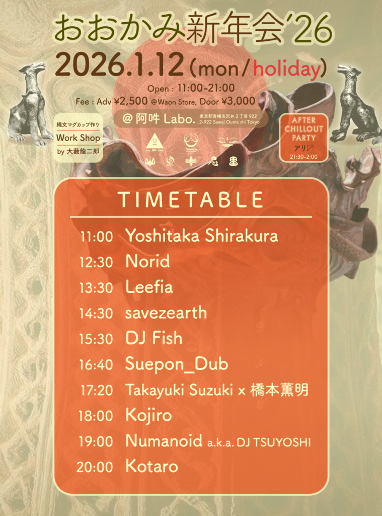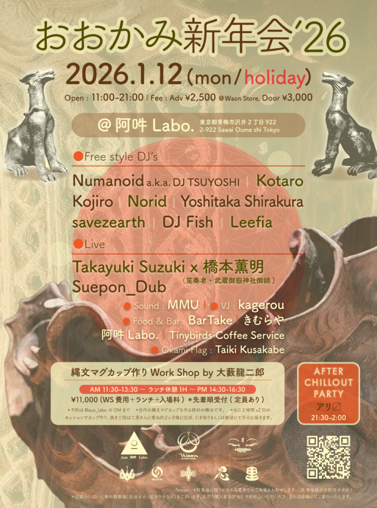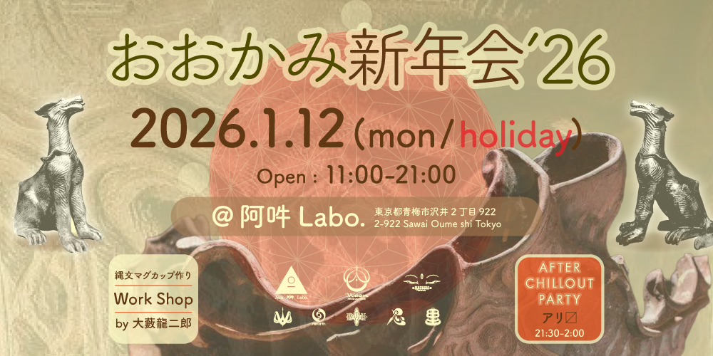 2019年に縄文土器作家大藪氏がオオカミの焼き物を奉納し産まれた”おおかみ奉納祭 2020 武蔵御嶽神社”。そのメンバーを中心に新年会を企画。東京都の聖山・御嶽山の麓に位置するギャラリー阿吽ラボを会場にゆかりのDJ陣と、ハンドパンと笙(しょう)のスペシャルコラボライブ、縄文マグカップ作りWSなどなど、お正月らしい飲食含めてお迎えいたします!